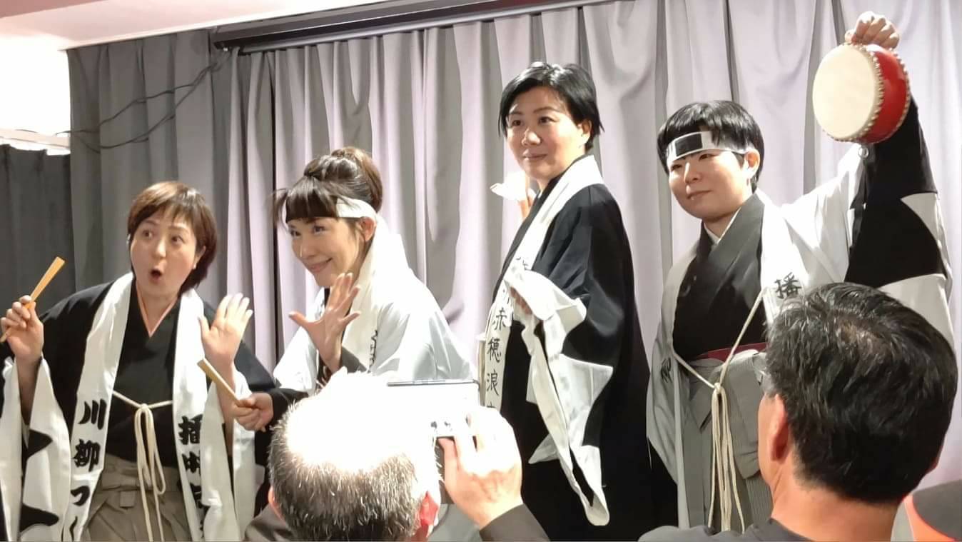 来られなかった皆様、赤穂浪士の勇姿をご覧ください(左から、つくし、風子、遊かり、花ごめ。私の羽織の文字は、三役格行司の木村容堂さんに書いていただきました)。
