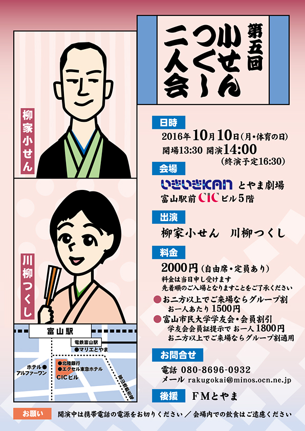 終演後、お時間あります方は1時間半コース料理¥2,500(できるだけご予約お願い致します)をご堪能下さいませ。もちろん、落語会のみの参加もOKです。