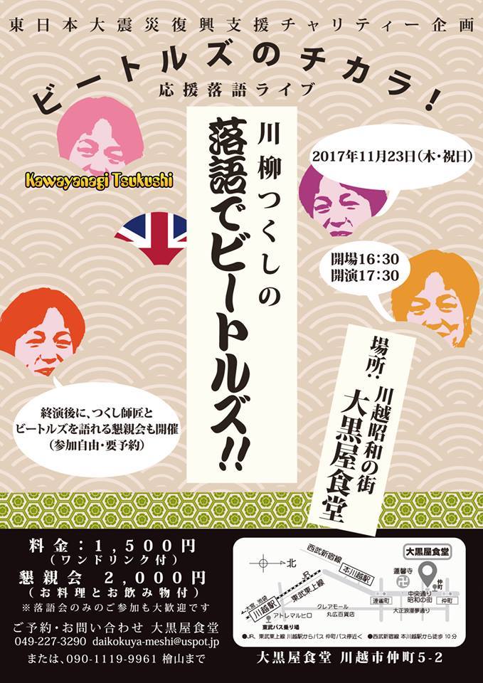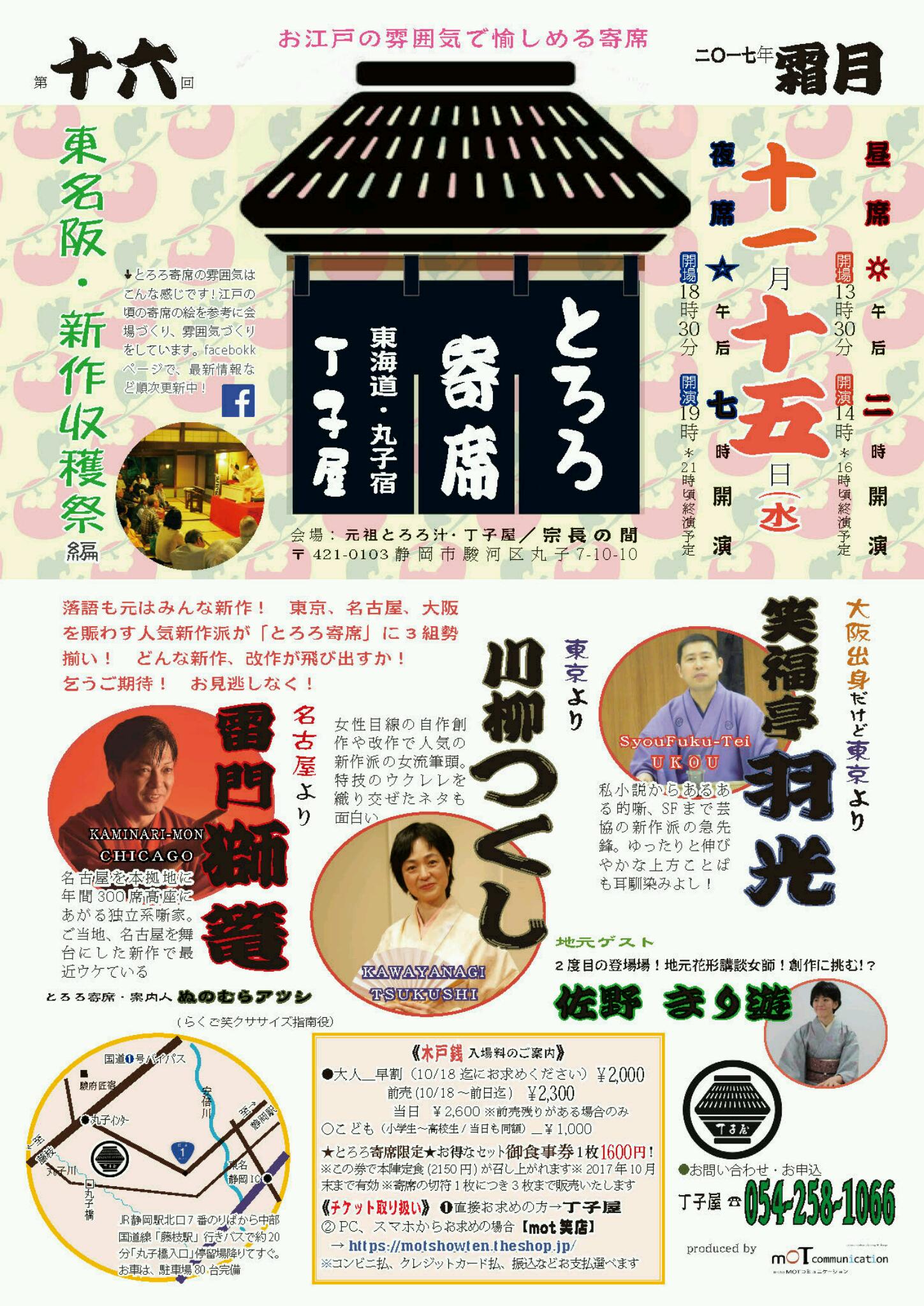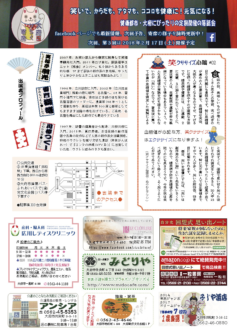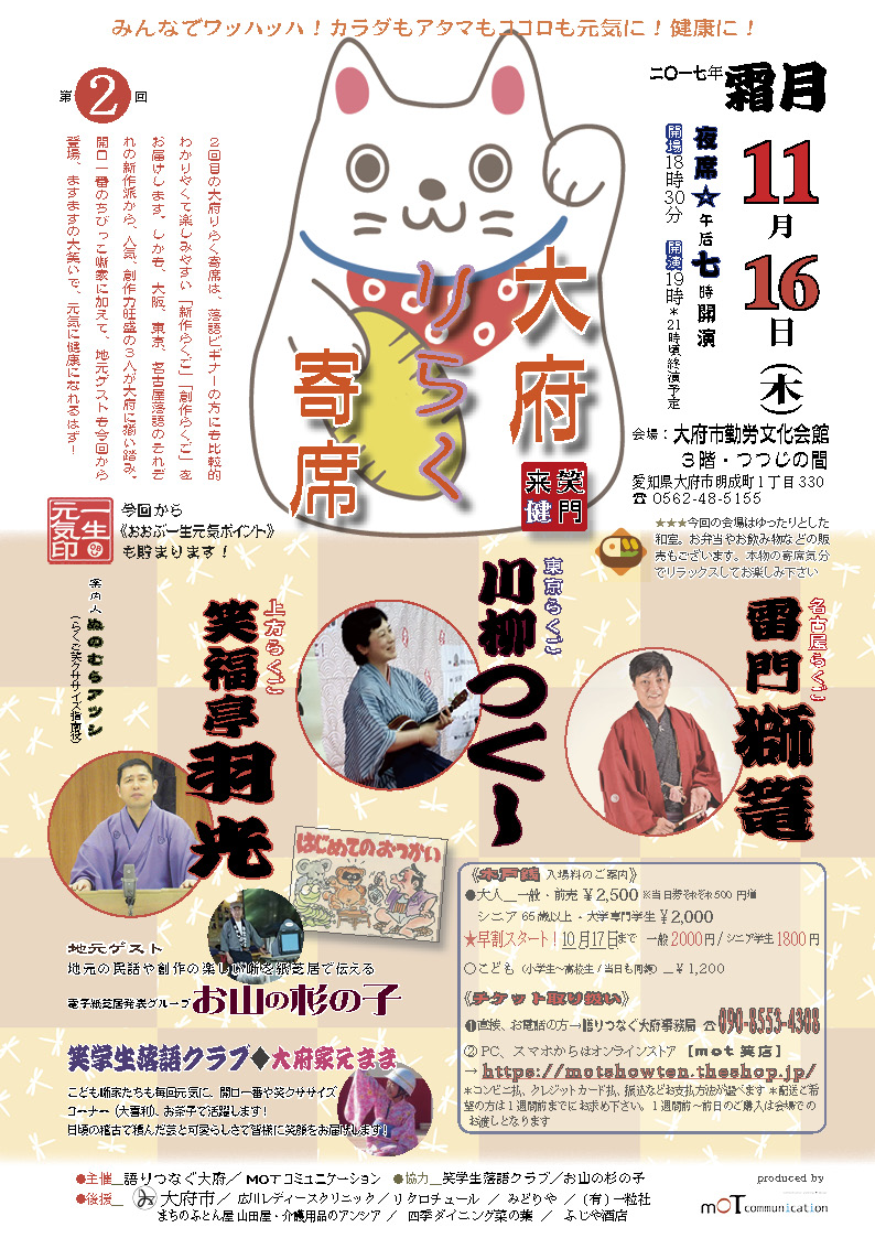 昨年11月、第1回大我落語会「川柳つくし独演会」(ゲスト:サメゾンビ)が開催されました。大変好評で、お客様方からの“ぜひまた同じメンバーで!”との声を受け、終演直後に第2回の開催が決定しました。
