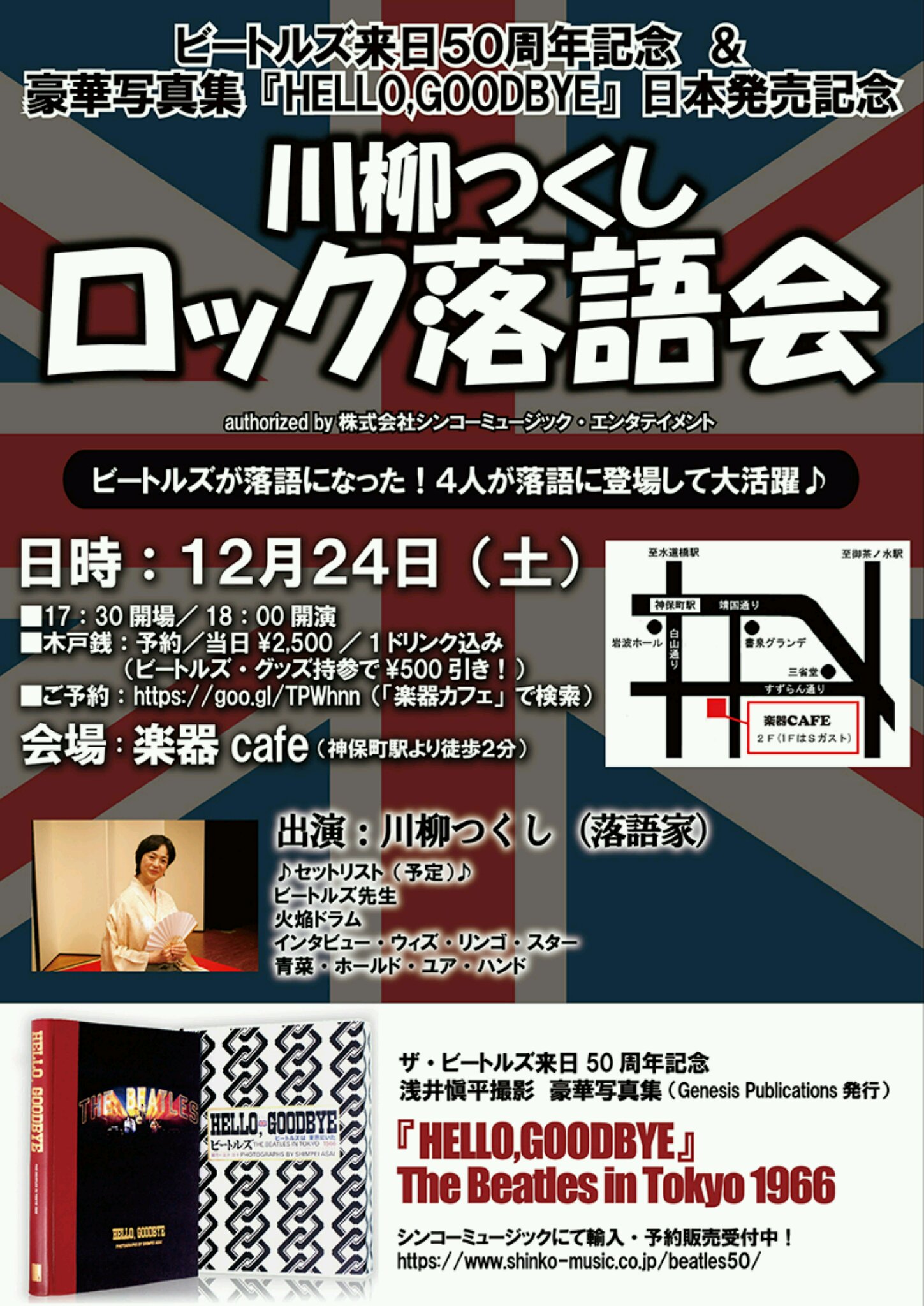 このたび、ビートルズ来日50周年を記念して、『HELLO,GOODBYE』という豪華写真集が発売されました。加えて、ビートルズの映画上映とリンゴさんの来日も受け、来月、来日50周年を締めくくるビートルズ落語会を開催します。