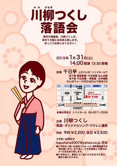 1月31日は、『川柳つくし落語会』。なんと大阪でのひとり会です。大阪での落語会は初めてですので、極めてアットホームな会になると思われます。近隣の皆様はもちろん、その他の地域の皆様も、ぜひ大阪見物がてら、お誘い合わせの上、ご来場くださいませ☆